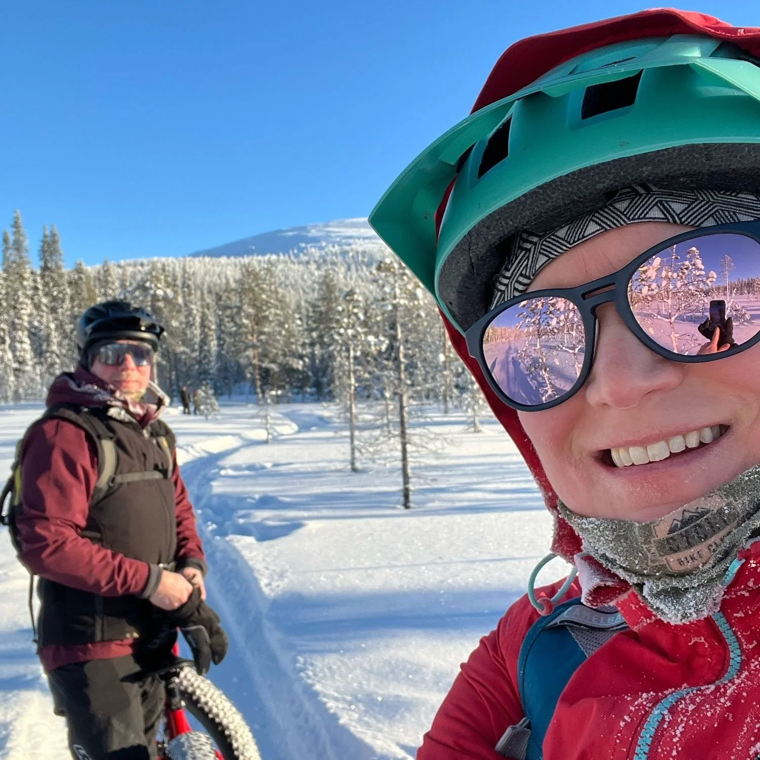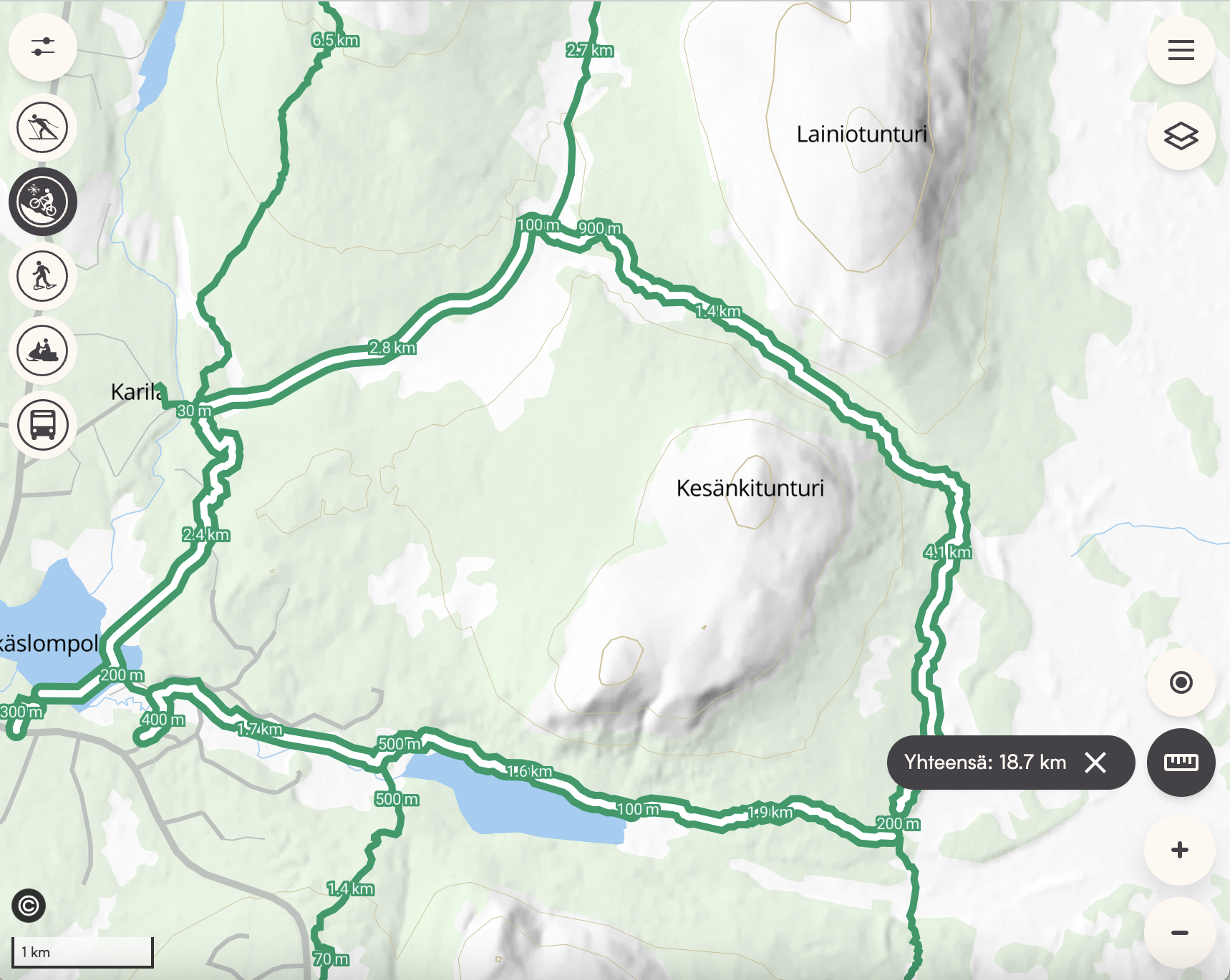 Meillä oli käytössä yhden tauon taktiikka, joten suuntasimme Karilan laturisteyksestä takaisin Äkäslompoloon. Valitsimme talvipolkureitin, joka näytti loppumatkan pituudeksi 2,5 kilometriä. Toinenkin, 2 km vaihtoehto olisi ollut tarjolla, mutta sen “sisällöstä” meillä ei ole tarkempaa tietoa. Sen sijaan tämä 2,5 km pätkä on tuttu; alkuun pientä kiipeämistä, mutta sen jälkeen palkintona hyvinkin vauhdikas lasku (kuskin niin halutessa) Äkäslompolo-järven jäälle. Siitä järven poikki takaisin kylälle ja kierros oli valmis. Majapaikan pihassa matkamittari näytti 22 kilometriä ja aikaa ajamiseen käytimme tällä kertaa noin 2,5 tuntia. Ajossa meillä oli Trekin Farley-luomuläskit - toisella 5 ja toisella 9.6.