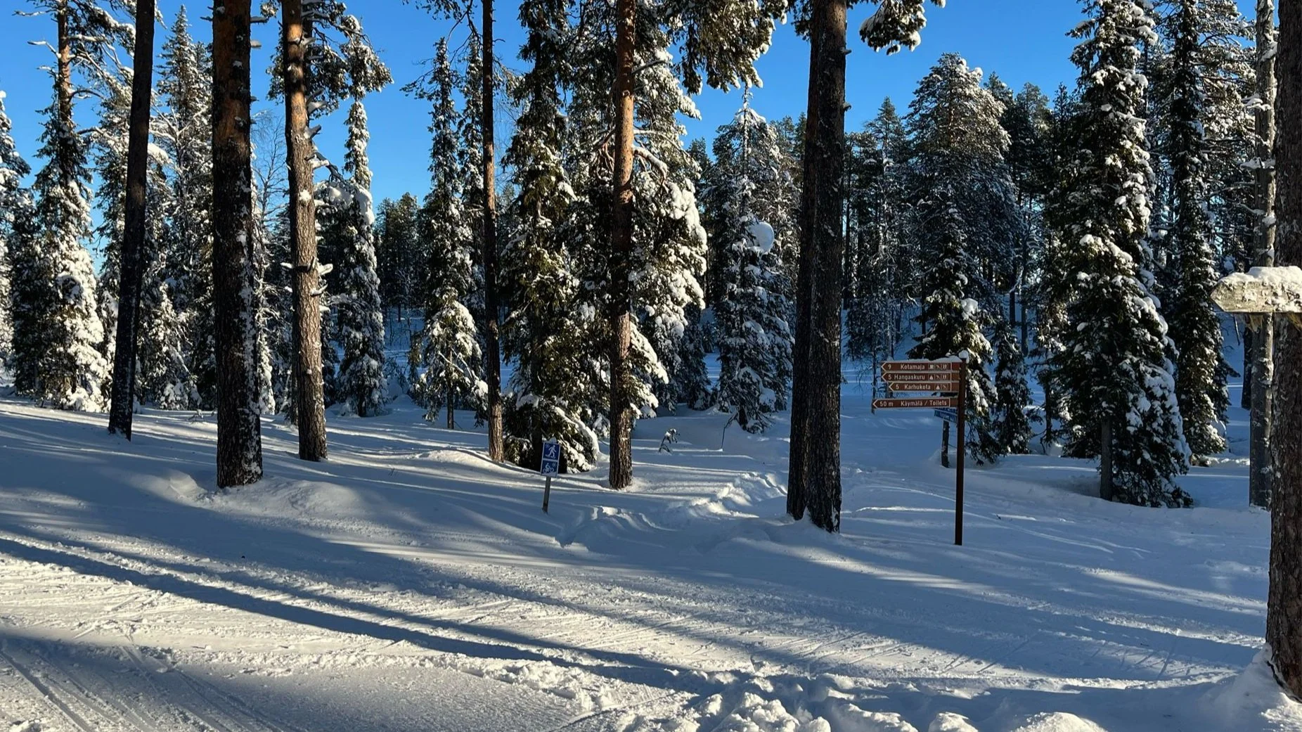 Näillä taustatiedoilla startattiin matkaan Äkäslompolon kylältä. Hyvä aloituspaikka reitille löytyy esimerkiksi Äkäsentien päästä Äkäshotellin ja Pirtukirkon ohi kuljettuaan. Pyöräilyyn tarkoitetut talvipolut on hyvin merkitty (pyöräilijä ja lumihiutale sinisellä pohjalla) ja ensimmäinen opaste löytyikin tien päästä.