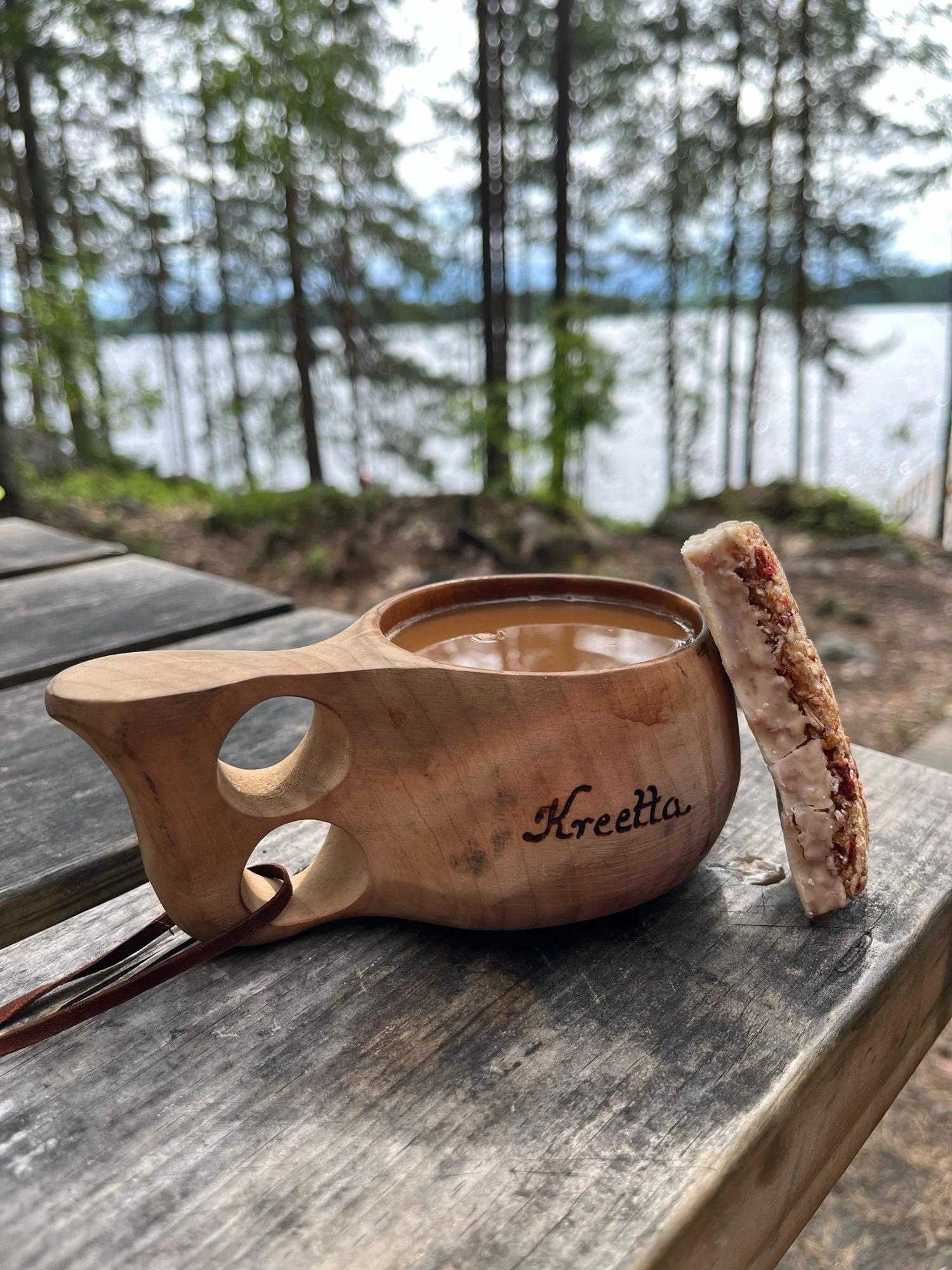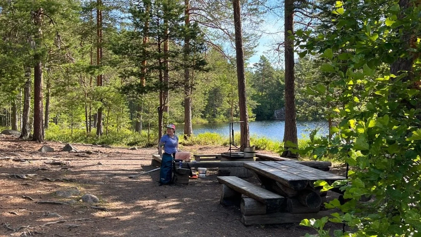 Ennen ja jälkeen päiväretken yövyimme mukavasti läheisen Rautalammin majoitus- ja ravintolapalveluista nauttien. Hyvin levänneinä pääsimme hurauttamaan aamukahdeksalta reitin lähtöpaikalle Kalajan pysäköintialueelle osoitteeseen Törmälän metsätie 136, Rautalampi. Viimeinen silaus retkilookkiin aurinkorasvalla ja hyttyskarkotteella ja ei kun menoks: alkupaloiksi tarjolla oli yhden kilometrin siirtymä reitin lähtöpisteelle, Vuori-Kalajan taukopaikalle. Olimme liikkeellä nautiskellen, joten ensimmäiset retkikeitinkahvit hörpittiin jo Vuori-Kalaja -lammen kauniissa rantamaisemissa.